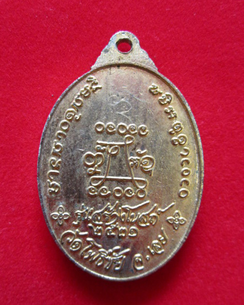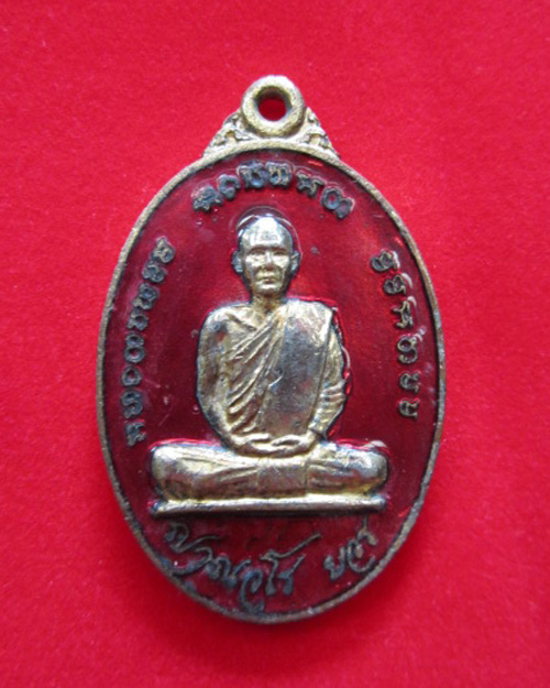 เหรียญทองแดงกะหลั่ยทองลงยาสีแดงมีจาร วัดโพธิ์ชัย จ. เลย ปี21