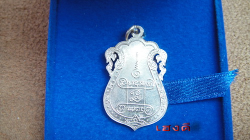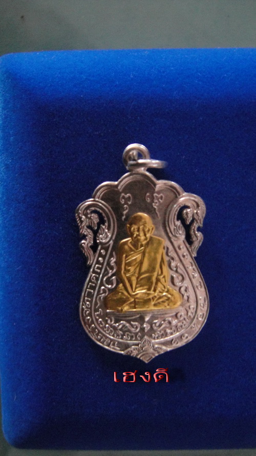 เหรียญฉลุ เนื้อเงินหน้าทอง หลวงปู่เอี่ยมวัดหนัง รุ่นรับเสด็จยกช่อฟ้ามหามงคล ปี 2554 พร้อมกล่องกำมะหยี่สีน้ำเงิน