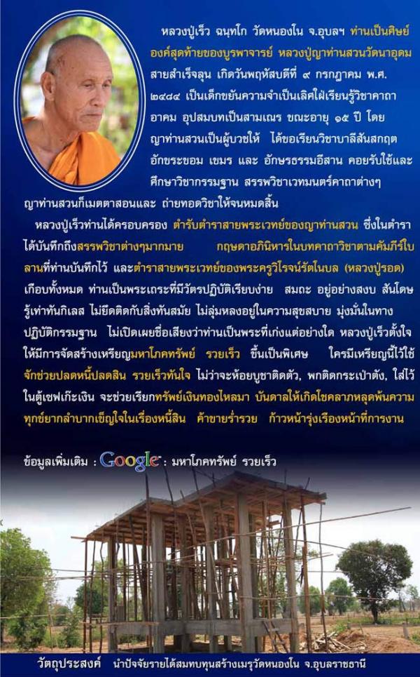 เหรียญรวยเร็วหลวงปู่เร็ว    ถือเป็นเหรียญที่ผ่านพิธีการปลุกเสกที่เข้มขลังถึง 7 วาระซึ่งหาค่อนข้างยากแล้วในปัจจุบัน  เพราะส่วนมากจะปลุกเสกกันแค่วาระเดียว  เหรียญรุ่นนี้ของหลวงปู่จึงเป็นเหรียญที่น่าสะสมและบูชาเป็นอย่างยิ่ง อนาคตต่อไปจะหายากขึ้นเรื่อยๆแน่นอน เพราะใครมีใครก็หวง  สำหรับผมมีอยู่ 3 เหรียญ เนื้อนวะ 2 เนื้อเงิน 1 กล่องเดิมๆจากวัด แบ่งกันได้เฉพาะเนื้อนวะเท่านั้นครับ ส่วนเนื้อเงินขอเก็บเอาไว้บูชาครับ