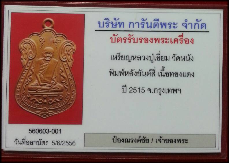 เหรียญหลวงปู่เอี่ยมวัดหนัง พิมพ์หลังยันต์สี่ ปี 2515 เนื้อทองแดง สภาพสวยมีบัตรรับรองพระแท้ รับประกันความแท้ 100 % ครับ