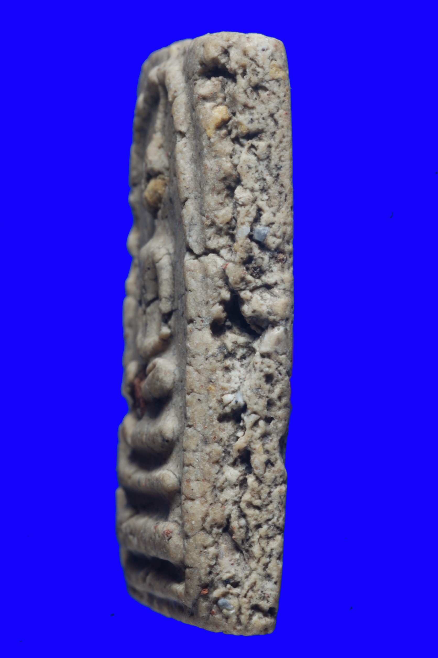พระองค์นี้ดั่งเดิมนั้น ก้อนมวลสารสีน้ำตาลไหม้แบบเก่าตรงกลางกับก่อนสีขาวอมเหลืองตรงพระพักตร์นั้น พิมพ์ออกมาใหม่ๆนั้นยังไม่เห็นเนื้อพระผ่านกาลเวลาก่อให้เกิดการหดตัวของเนื้อพระและการยุบตัวของมวลสาร ก่อให้เกิดการกระเทาะ หลุดหลุยหรือบิ่นออกไป เป็นบ่อน้ำตาขนาดใหญ่ให้เห็นถึงมวลสารอันเป็นมงคล
