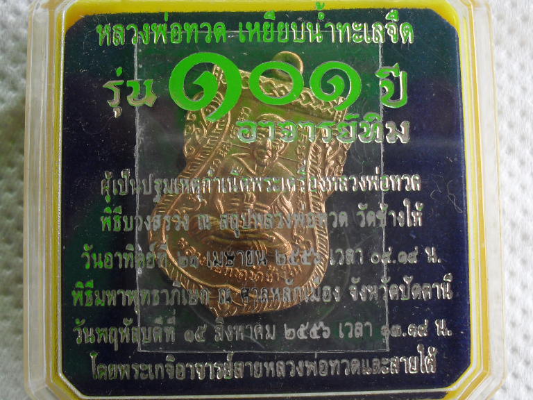 เหรียญหลวงพ่อทวด เนื้อทองดอกบวบ พิมพ์เสมาหน้าเลื่อนโบราณย้อนยุค หลัง 101 ปีอาจารย์ทิม หลังมีโค๊ตและรันนิ่งหมายเลขกำกับไว้ ปี 2556 รุ่น 101 ปี อาจารย์ทิมผู้เป็นอดีตชาติสามเณรบุญรอดเดินบนน้ำ ศิษย์เอกหลวงพ่อทวดเหยียบน้ำทะเลจืด รุ่น101ปี อาจารย์ทิมได้ประกอบพิธีบวงสรวง ณ สถูปหลวงพ่อทวด วัดช้างให้ เมื่อวันอาทิตย์ที่ 21 เมษายน 2556 เวลา 09.19น. และพิธีพุทธาภิเษก ณ ศาลหลักเมืองจังหวัดปัตตานี วันพฤหัสบดีที่ 15 สิงหาคม 2556 เวลา 13.19น. โดยพระเกจิอาจารย์สายหลวงพ่อทวดและสายใต้