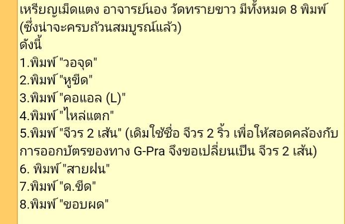 หรียญเม็ดแตงรุ่นแรกและสุดท้ายอาจารย์นองวัดทรายขาว จังหวัดปัตตานีบล็อคหลังสายฝนเหรียญนี้ เป็นพิมพ์นิยม ท่านสร้างไว้ก่อนมรณภาพสามเดือน และเป็นครั้งแรกที่ท่านสร้างเหรียญเม็ดแตง และเป็นครั้งสุดท้ายด้วยเพราะหลังจากนั้นท่านได้มรณภาพ